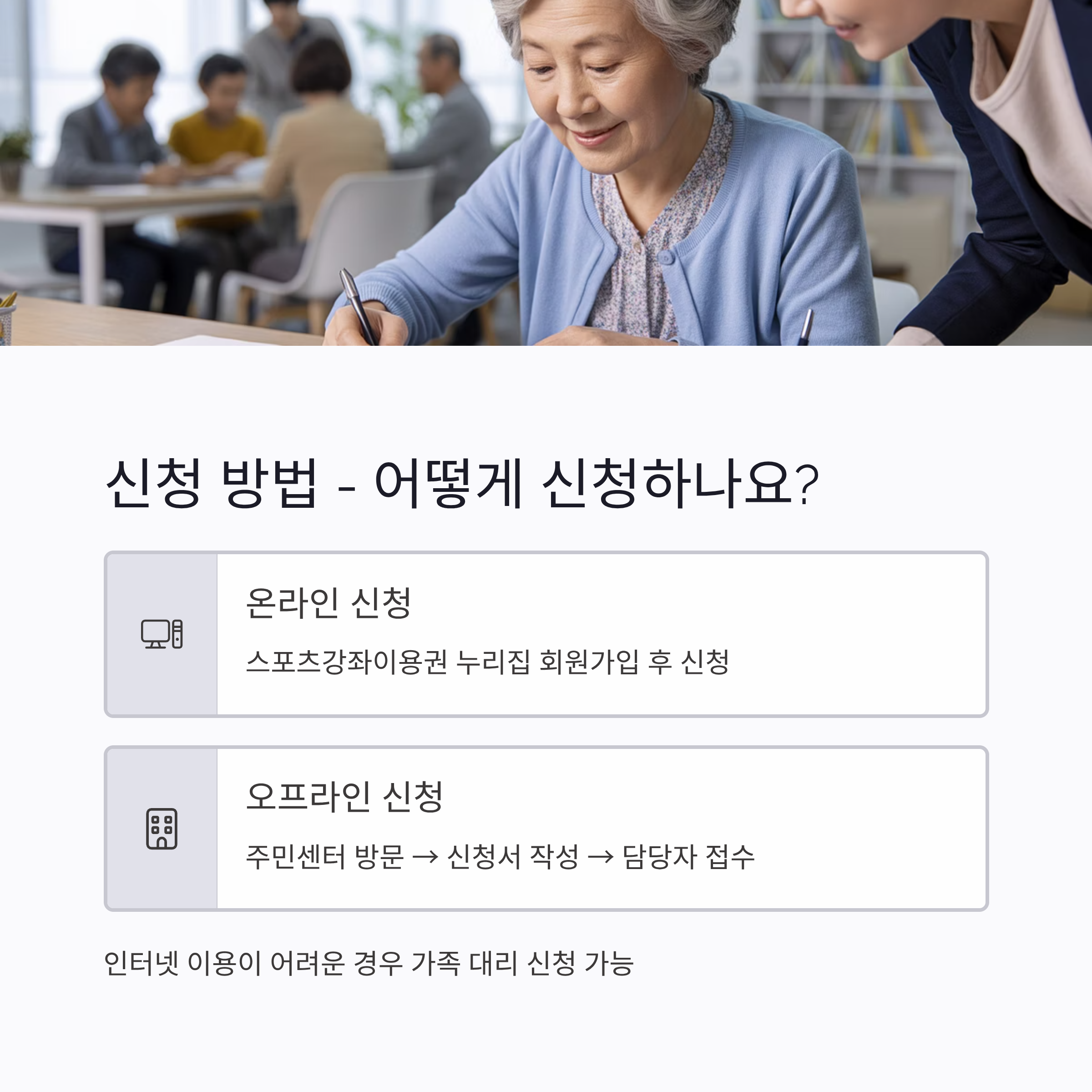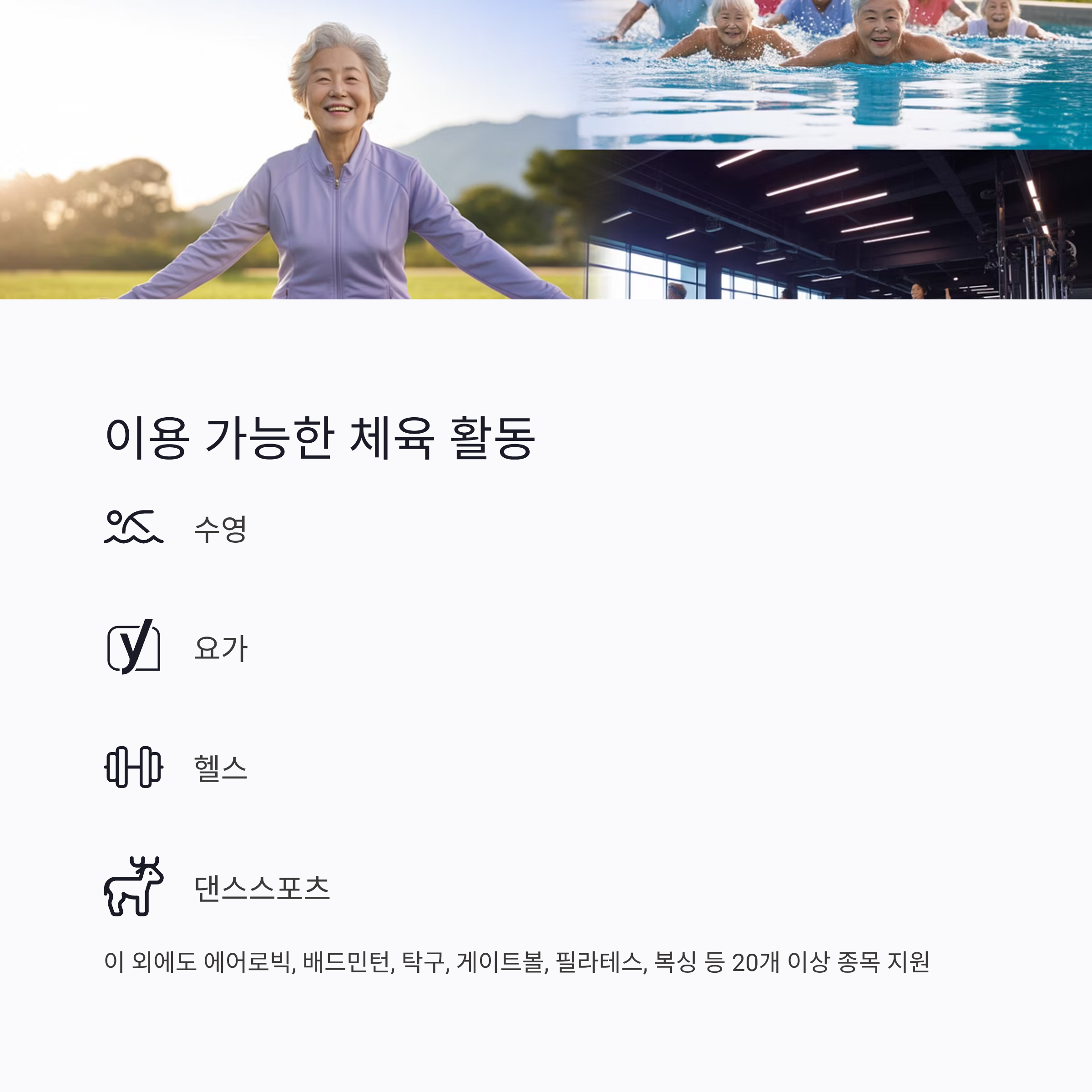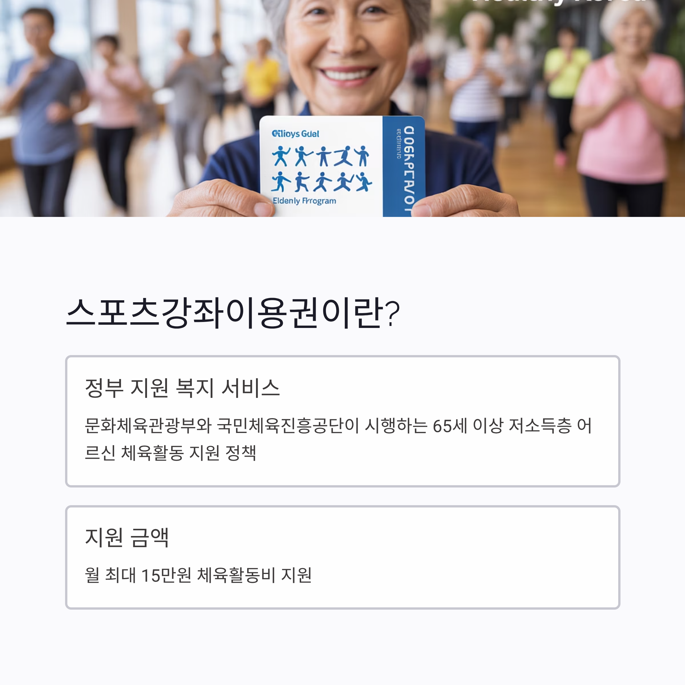 건강한 노년을 위한 정부 지원 혜택, 스포츠강좌이용권은 65세 이상 어르신께 매월 체육활동비를 지원하는 복지 서비스입니다. 신청 조건, 지원금액, 사용 방법까지 최신 정보를 정리해드리니 꼭 확인해보시고 신청 기간을 놓치지 마세요!
