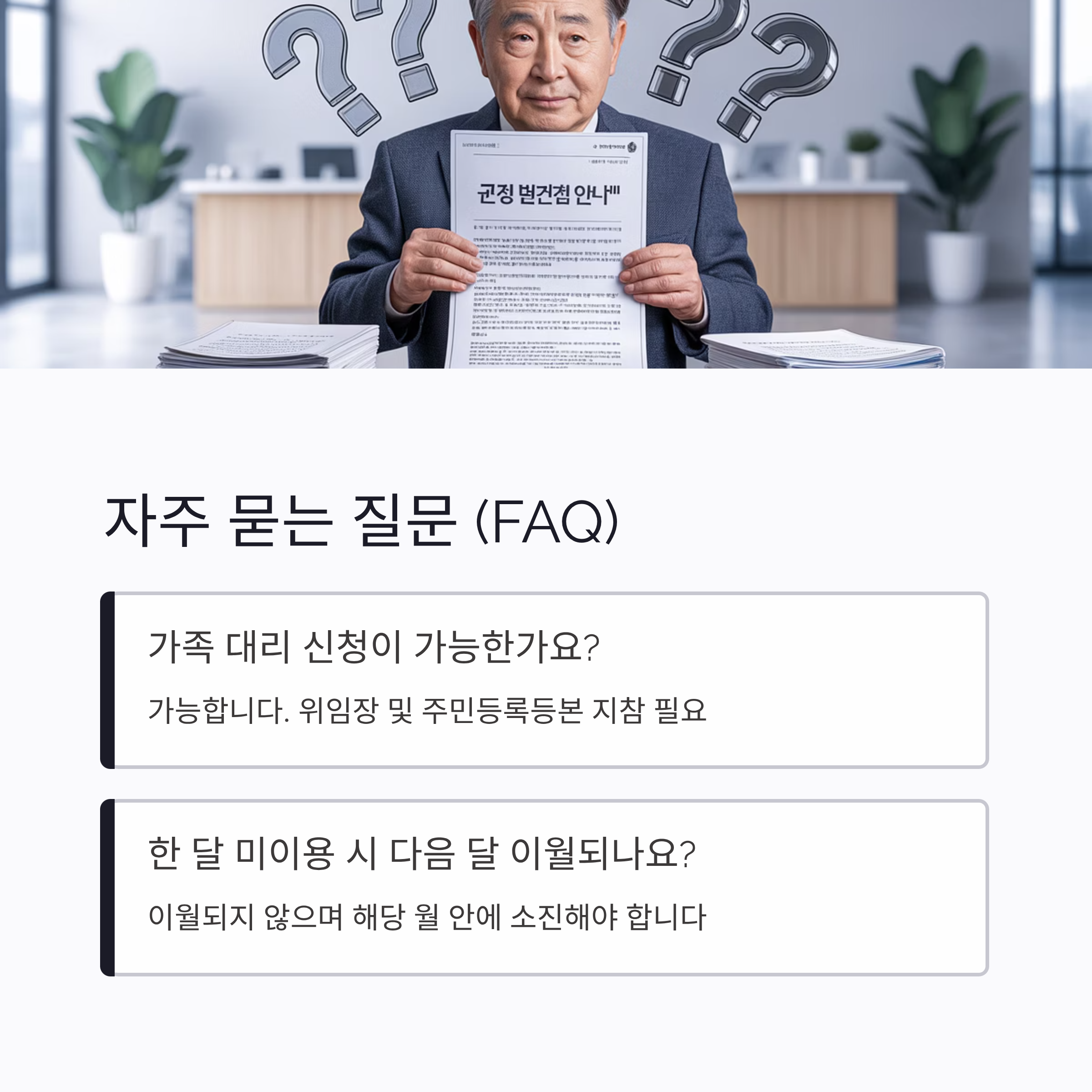 | 가족 대리 신청이 가능한가요? | 가능합니다. 위임장 및 주민등록등본 지참 필요 |