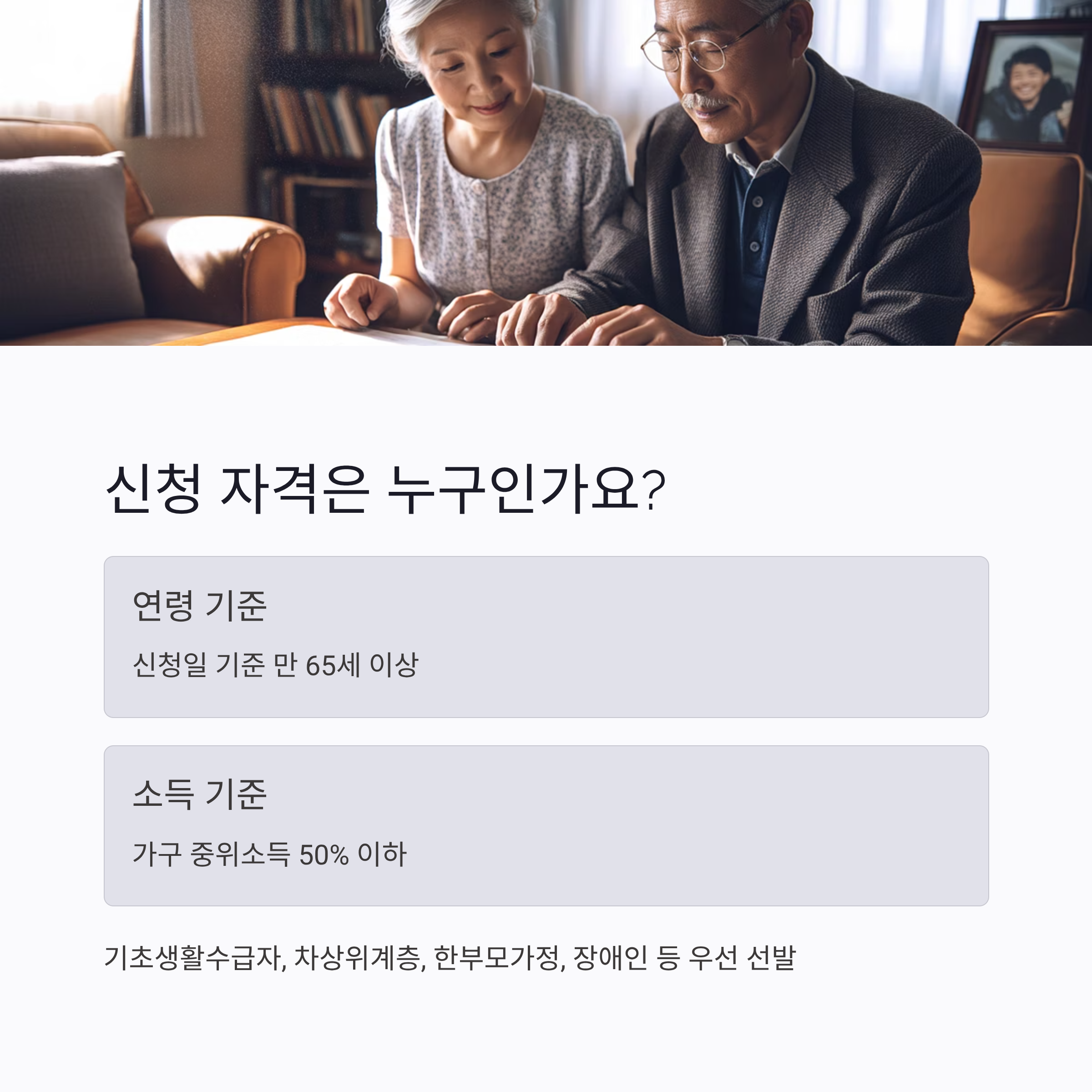 지원 대상은 만 65세 이상 어르신 중 아래 조건을 충족하는 분들입니다.