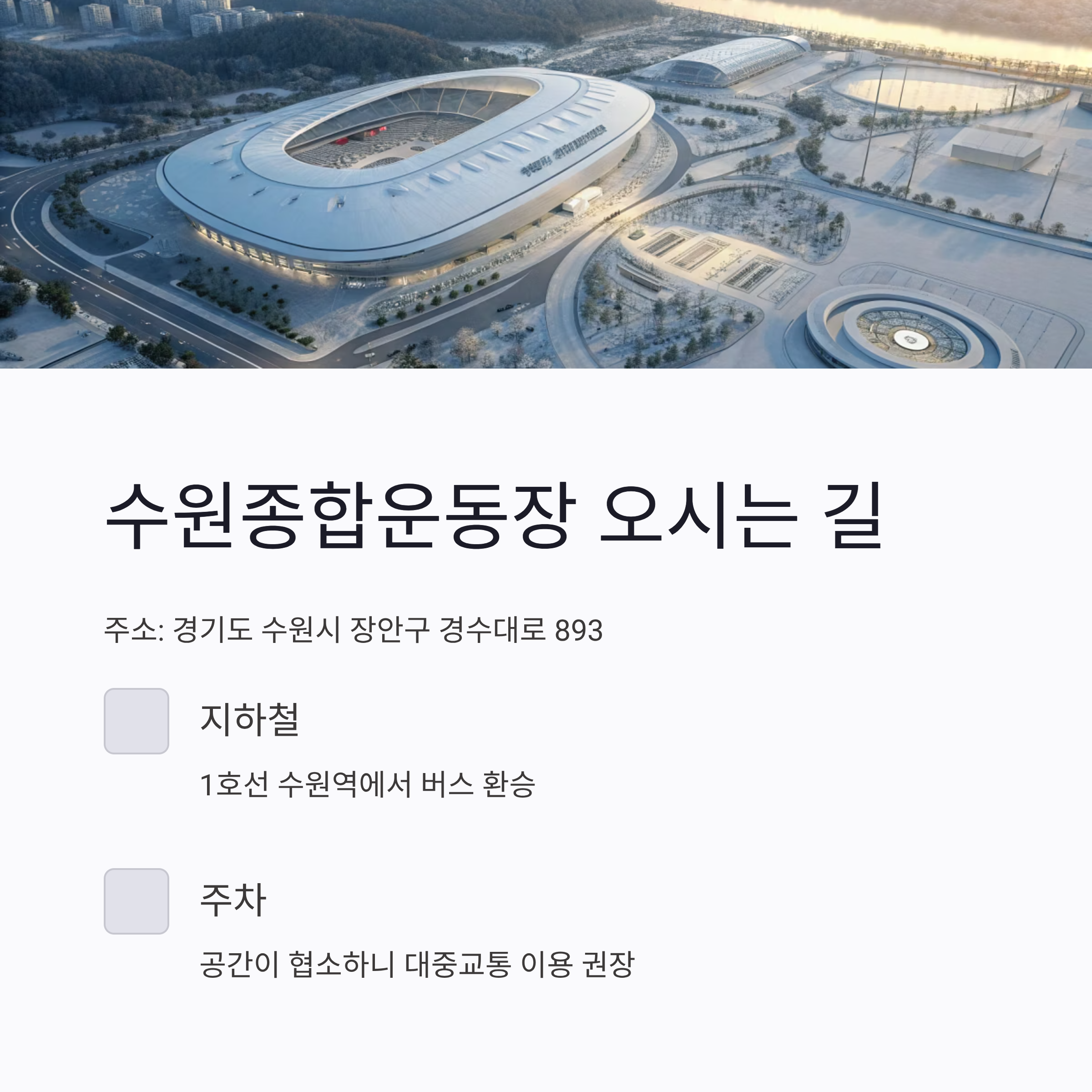 지하철 1호선 수원역 또는 버스를 이용해 접근 가능합니다.